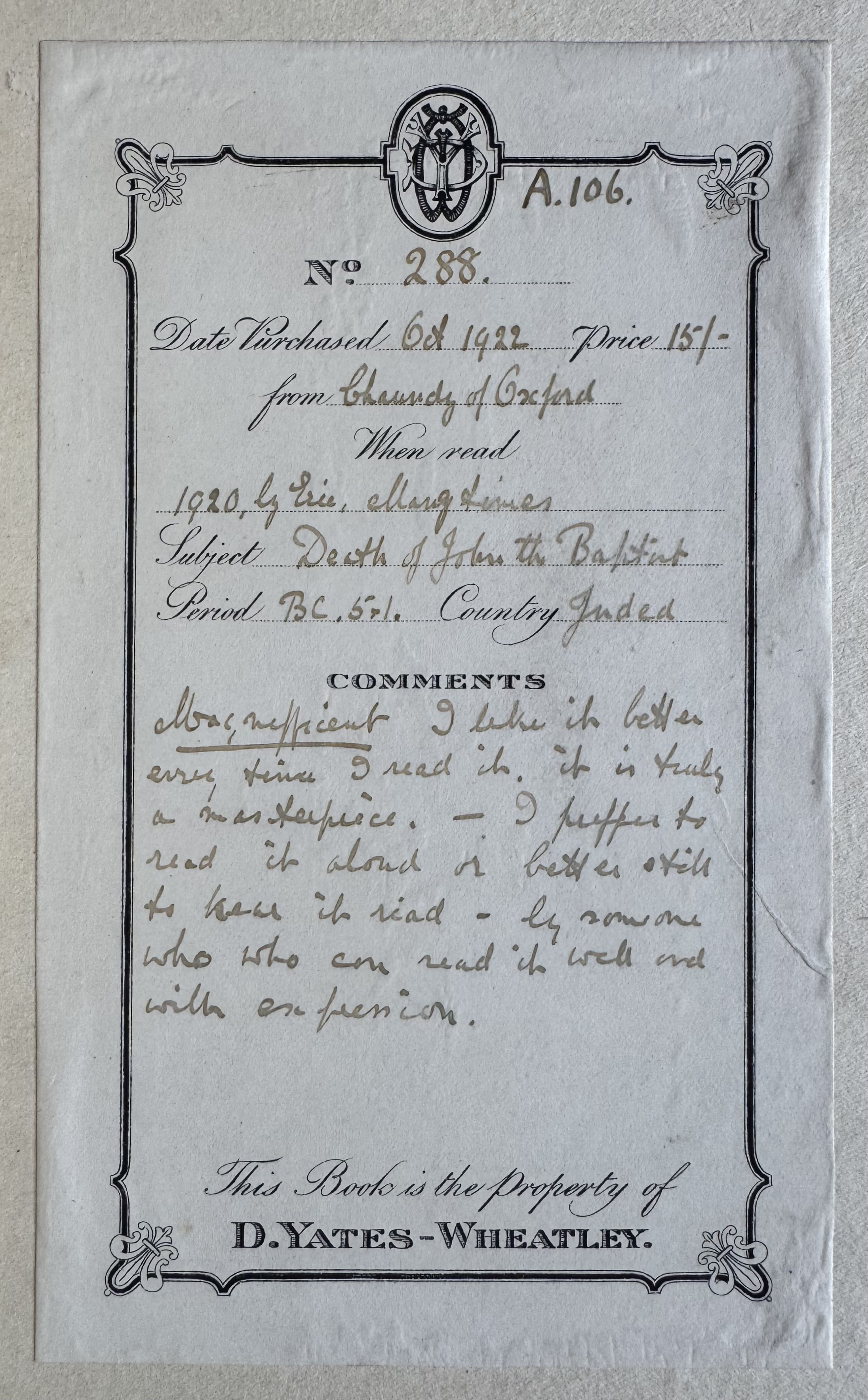When Dulau produced a catalogue of Oscar Wilde material for sale in 1928, they produced 105 special copies on handmade paper on top of a ‘trade’ issue of 2,000 copies; and they presented Copy No. 1 of the special issue to DW with the following inscription :