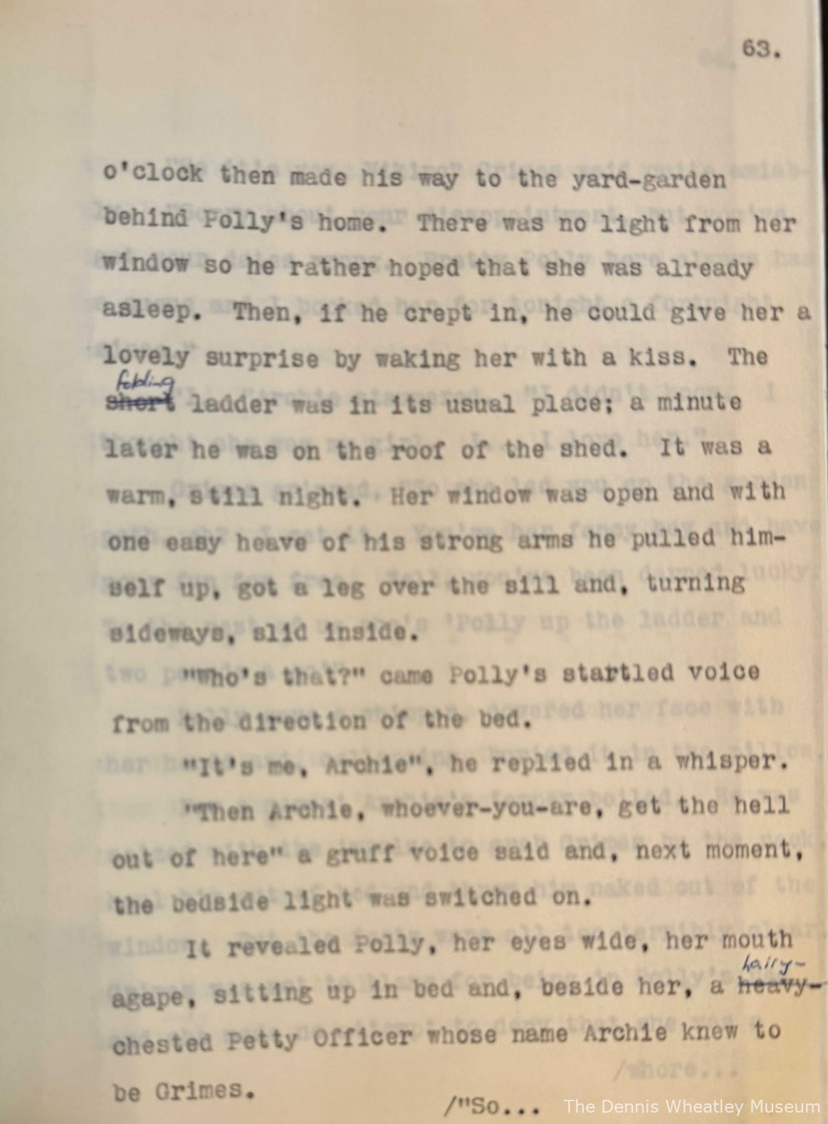 As can be seen from the above exhibit, DW changed the name of the hero of 'Unholy Crusade' from 'Archie' to 'Adam' at the very last minute, as well as making other - and more minor - changes to the typescript. In one illustrated above, he changes a 'short ladder' to a 'folding ladder'.