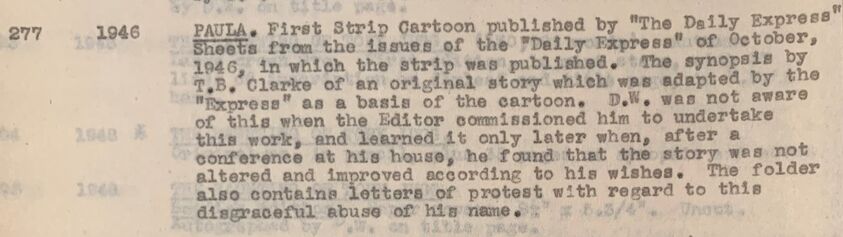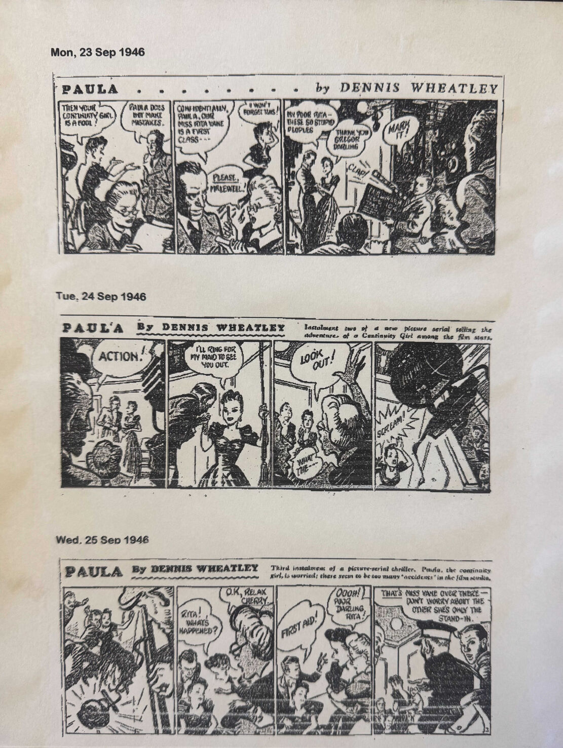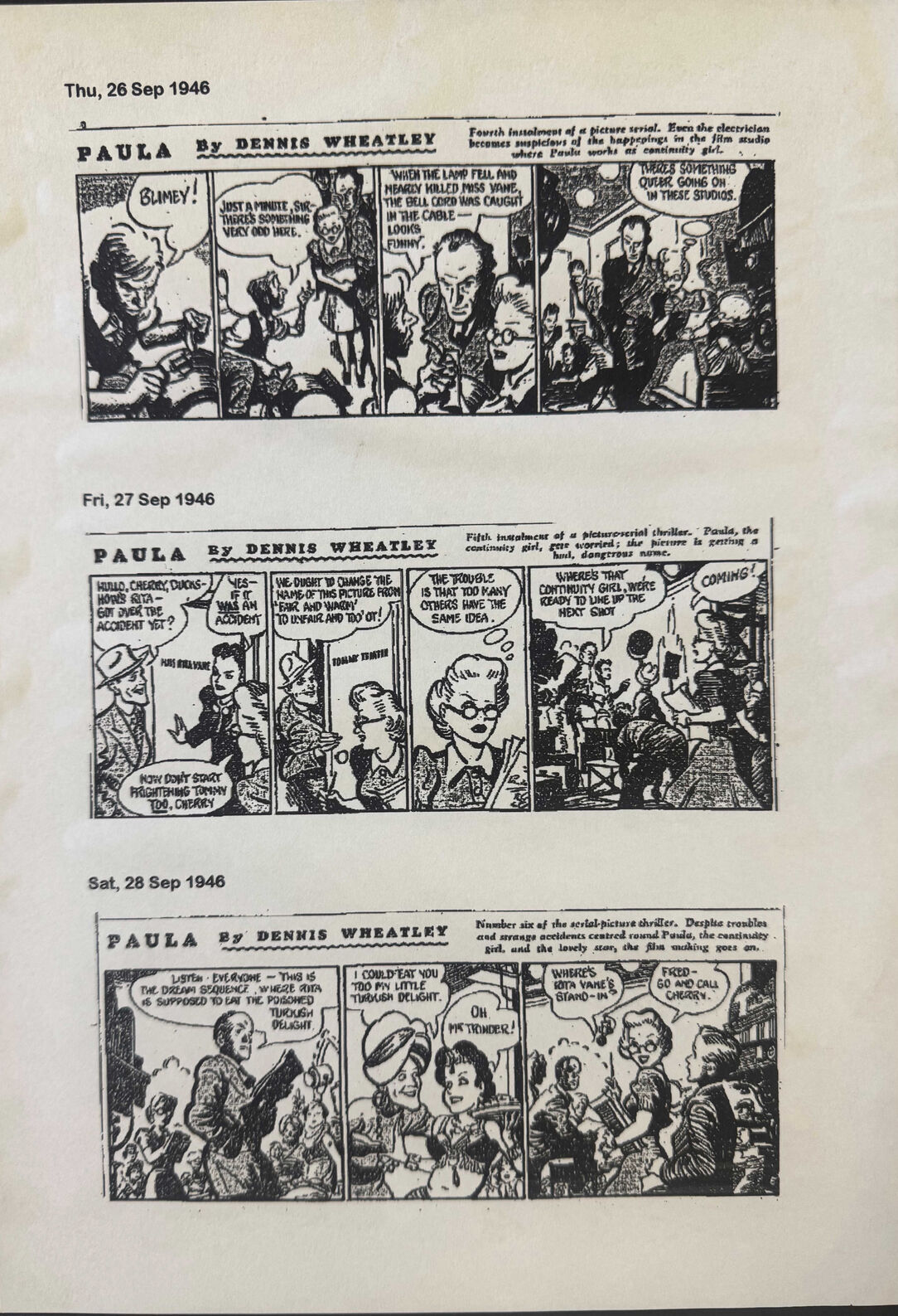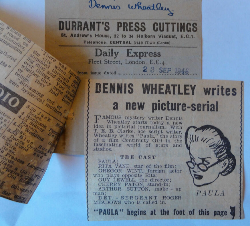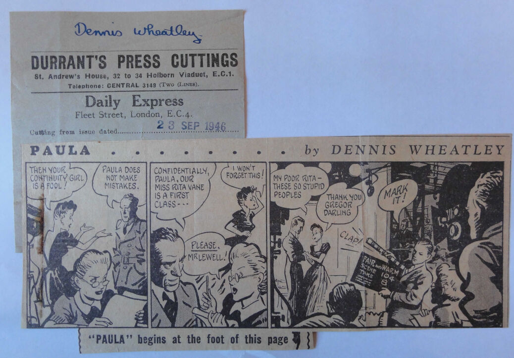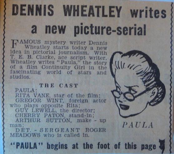 As Darren Nugent told the Convention in 2015, Paula was a comic strip that appeared in the Daily Express between 23rd September and 23rd November 1946. According to the blurb in the Daily Express it was written by DW along with ‘ace scriptwriter’ T.E.B. Clarke and each strip was headed ‘Paula by Dennis Wheatley’, but the reality was - as DW was to discover to his great annoyance - that it was written exclusively by T.E.B. Clarke and DW was permitted to play no part in the creative process. In these more litigious times, DW might well have reached out to his lawyers as this seems to have been the result of a misrepresentation to both him and his public.