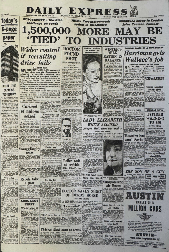 The front page of the Daily Express on 23 September 1946, and the inside page with 'Paula'