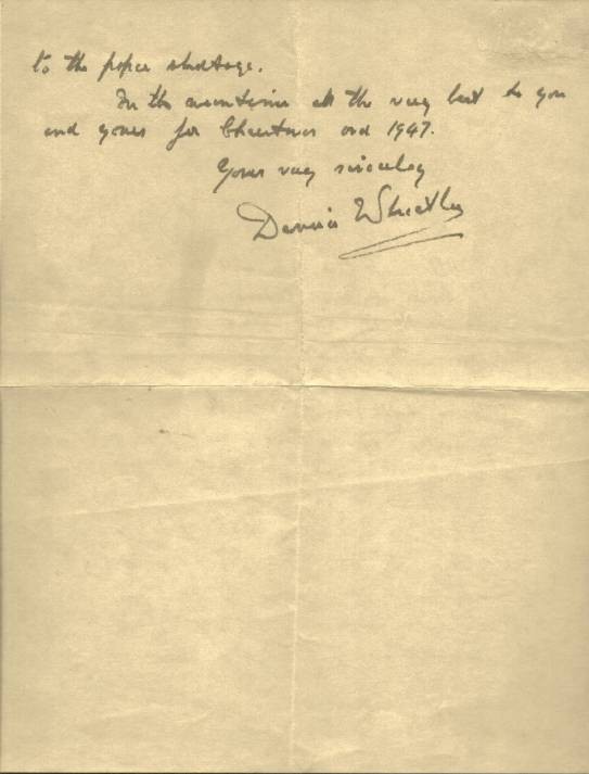 | Dear Mr Downing, I trust that you will have received your copy of 'Come into My Parlour' back by this, as I sent it off at once rather than wait until I had time to reply to your letter. About the books of mine you enquire for. I am happy to be able to send you a copy of 'Sixty Days to Live', as I have a few first editions by me, and shall be glad if you will accept it as a small contribution from an author to a very faithfull reader. Regarding 'The Black Baroness' I fear that I cannot help you; but Hutchinsons did a reprint last year so they might have a 5/- copy left. I rather doubt it though as during the war all my books went out of print, and hardly any of them have been reprinted in quantity owing to the paper shortage. In the meantime all the very best to you and yours for Christmas and 1947. Yours very sincerely Dennis Wheatley |